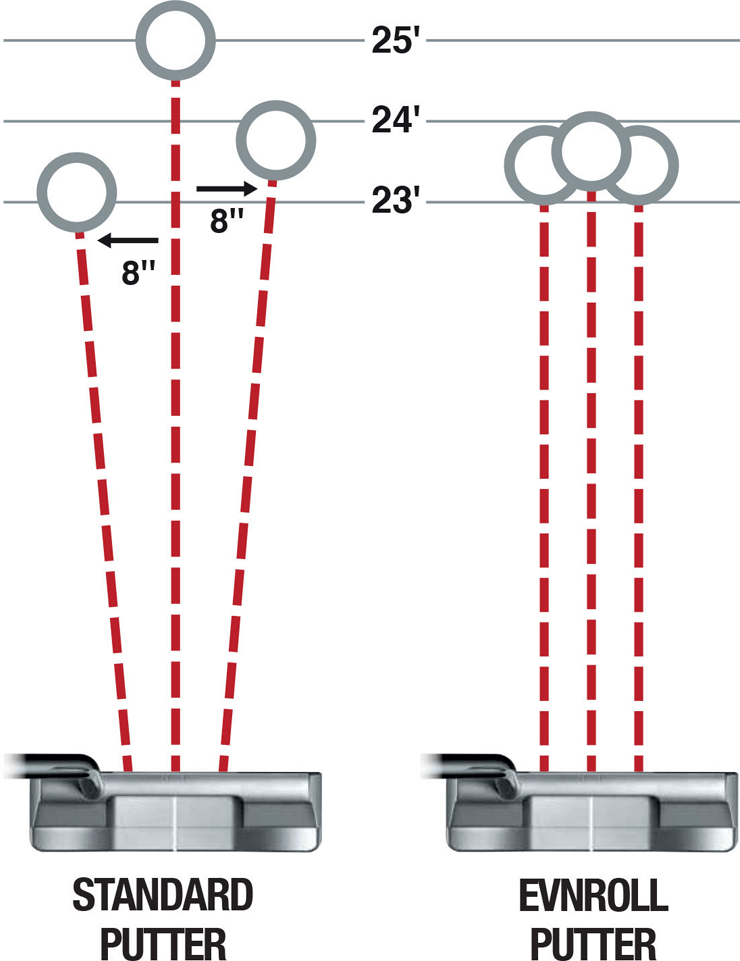Rezultaty zastosowania „Sweet Face Technology” są takie że piłka praktycznie toczy się na tą samą odległość i w tym samym kierunku przy uderzeniach sweetspotem jak i nie trafione idealnie. Własnie dlatego puttery Evnroll zapewniają niespotykaną dokładność.