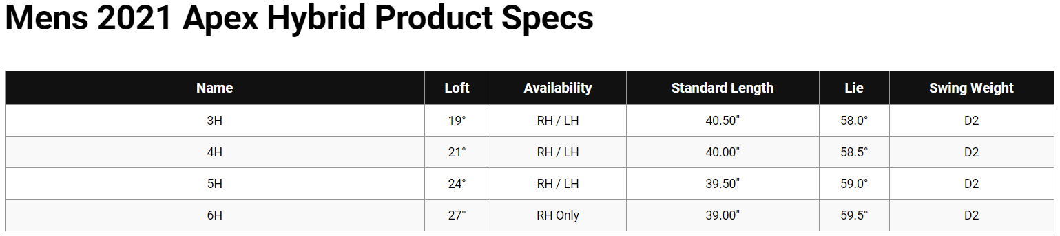 Hybrydy Apex 21 posiadają regulowany hosel dzięki czemu możliwa jest niezależna zmiana kątów loft i lie. Dzięki temu można je idealnie dostosować do potrzeb każdego golfisty.