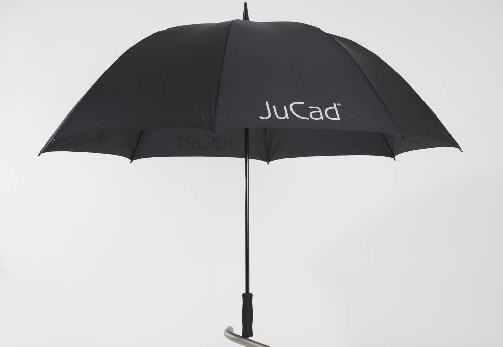 Ekstralekki, ogromny parasol golfowy JuCad ochroni przed każdymi warunkami pogodowymi. Jest wyposażony w trzpień i uchwyt przeciwwiatrowy służący do łatwego przymocowania go do rączki wózka JuCad (jak widać na załączonym obrazku). Dodatkowy uchwyt na parasol jest więc niepotrzebny.