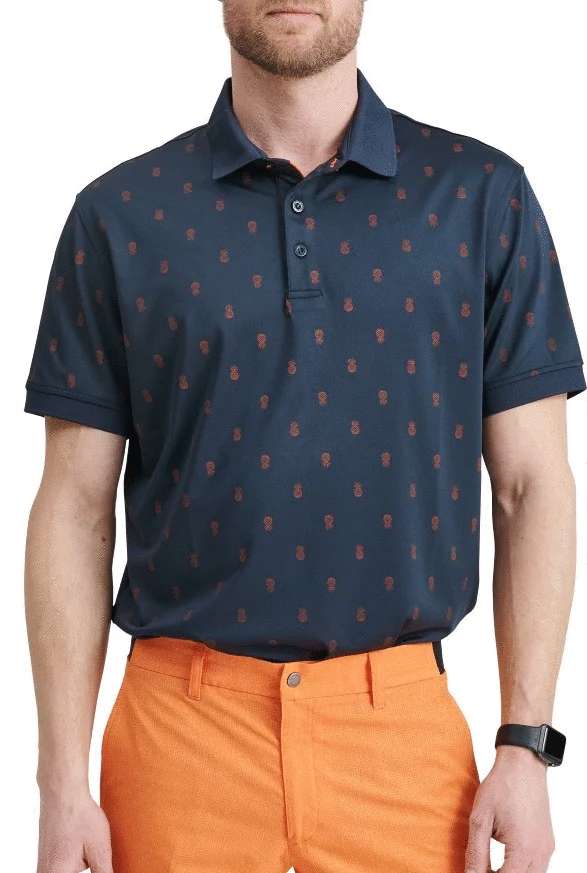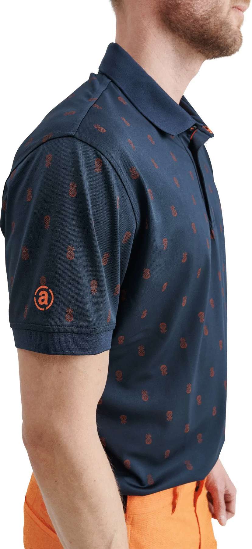 Dower polo jest wykonane z bardzo rozciągliwej, lekkiej dzianiny pique, która ma również działanie drycool i odprowadzanie wilgoci. Polo ma trzy guziki z przodu i płaski dzianinowy kołnierz. Nadrukowane ananasy na całej powierzchni ciała. Logo Abacus na prawym rękawie.