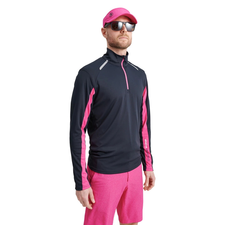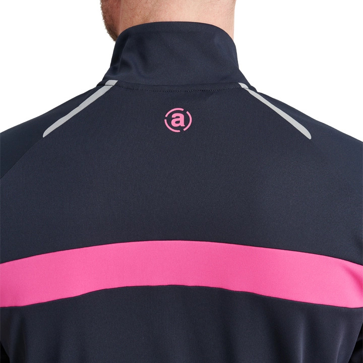 Longsleeve Cypress halfzip w kolorze granatowym jest wykonany z bardzo elastycznego, lekkiego materiału z efektem DryCool. Zamek błyskawiczny z przodu ma różowy kontrastowy kolor. Różowe kontrastowe paski wzdłuż rękawów i na plecach. Logo Abacus na karku pod kołnierzem i wzdłuż lewego rękawa. Ten sweter jest idealny jako warstwa 1, ale także jako cienka warstwa 2.